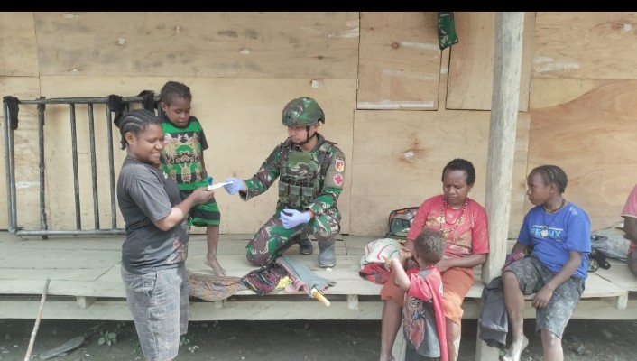 Bermula saat Mama Emite Telenggen (44) datang ke Pos Yambi meminta tolong karena anaknya mengalami sakit dibagian kaki kiri, dengan sigap Bakes Pos Ramil Yambi Serda Rian langsung melaksanakan pengobatan luka infeksi yaitu dengan membersihkan luka dengan cairan infus kemudian memberikan anti biotik serta vitamin agar dapat membaik dan penyembuhannya cepat, “Mama kalau butuh apa-apa datang ke Pos e kita semua disini papa pu sodara,” ucapnya.