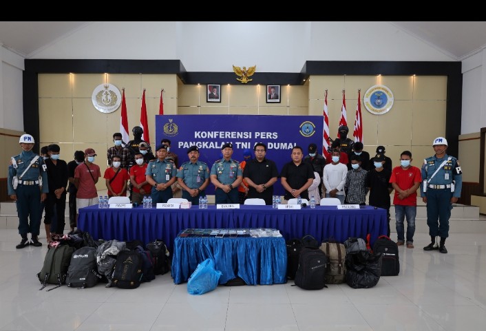 TNI AL, Dumai,-Swaranusa7.com-Tim F1QR Pangkalan TNI Angkatan Laut (Lanal) Dumai dan Tim Satgas Denintel Koarmada I berhasil menggagalkan pengiriman 19 orang Calon Pekerja Migran Indonesia (PMI) Non Prosedural yang akan berangkat ke Malaysia melalui jalur ilegal. Selain itu, Tim Gabungan juga mengamankan 2 orang diduga pelaku Tindak Pidana Penyeludupan Manusia (TPPM) dan 1 unit speed boat dengan 3 mesin, Kamis (8/5/2025).
