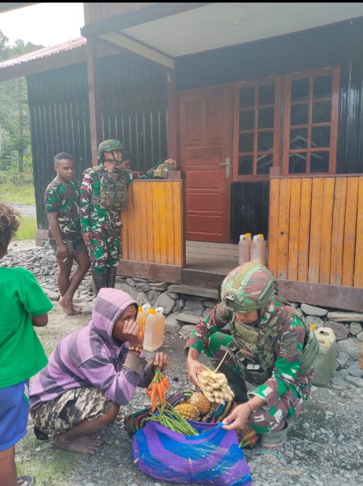Puncak Jaya,Swaranusa7.com-Dalam rangka mendukung program ketahanan pangan dan meningkatkan kesejahteraan masyarakat, Satgas Pamtas Kewilayahan Yonif 715/Mtl Pos Kulirik melaksanakan kegiatan borong hasil bumi masyarakat di Kampung Yalinggua, Distrik Mulia, Kabupaten Puncak Jaya, Papua, Rabu (14/05/2025).