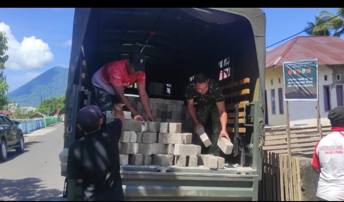 Halmahera Barat,Swaranusa7- Progres TMMD Ke-124 Kodim 1501/Ternate terus di kebut dengan kegiatan pengangkutan material pembangunan ke lokasi-lokasi sasaran TMMD di Kecamatan Sahu, Kabupaten Halmahera Barat. Anggota Satgas TMMD bersama masyarakat setempat bergotong royong menurunkan bahan material, seperti semen, batu tela, seng, kayu, dan besi. Selasa (20/5/2025).