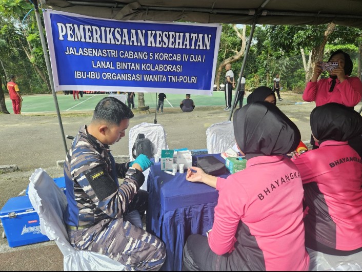 TNI AL, Bintan,Swarnusa7.com-Jalasenastri Cabang 5 Korcab IV Daerah Jalasenastri Armada I Lanal Bintan berkolaborasi dengan ibu-ibu organisasi wanita TNI-Polri melaksanakan kegiatan pemeriksaan kesehatan umum pada kegiatan olahraga bersama TNI-POLRI di Mako Brimob Tanjung Uban, Sabtu (21/06/2025).
