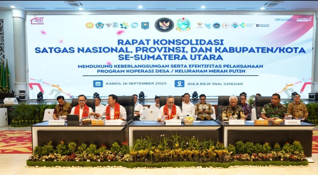 TNI AL, Belawan,Swaranusa7.com- Komandan Kodaeral I Laksamana Muda TNI Deny Septiana, S.I.P., M.A.P., diwakili Wadan Kodaeral I Kolonel Marinir Ali Bahar Saragih, S.E., M.M., menghadiri Rapat Konsolidasi Satgas Nasional, Provinsi, dan Kabupaten/Kota Se-Sumatera Utara untuk mendukung keberlangsungan serta efektifitas pelaksanaan program Koperasi Desa Merah Putih (KDMP) yang dilaksanakan di Aula Raja Inal Siregar Kantor Gubernur Sumut, Kamis (19/9/2025).