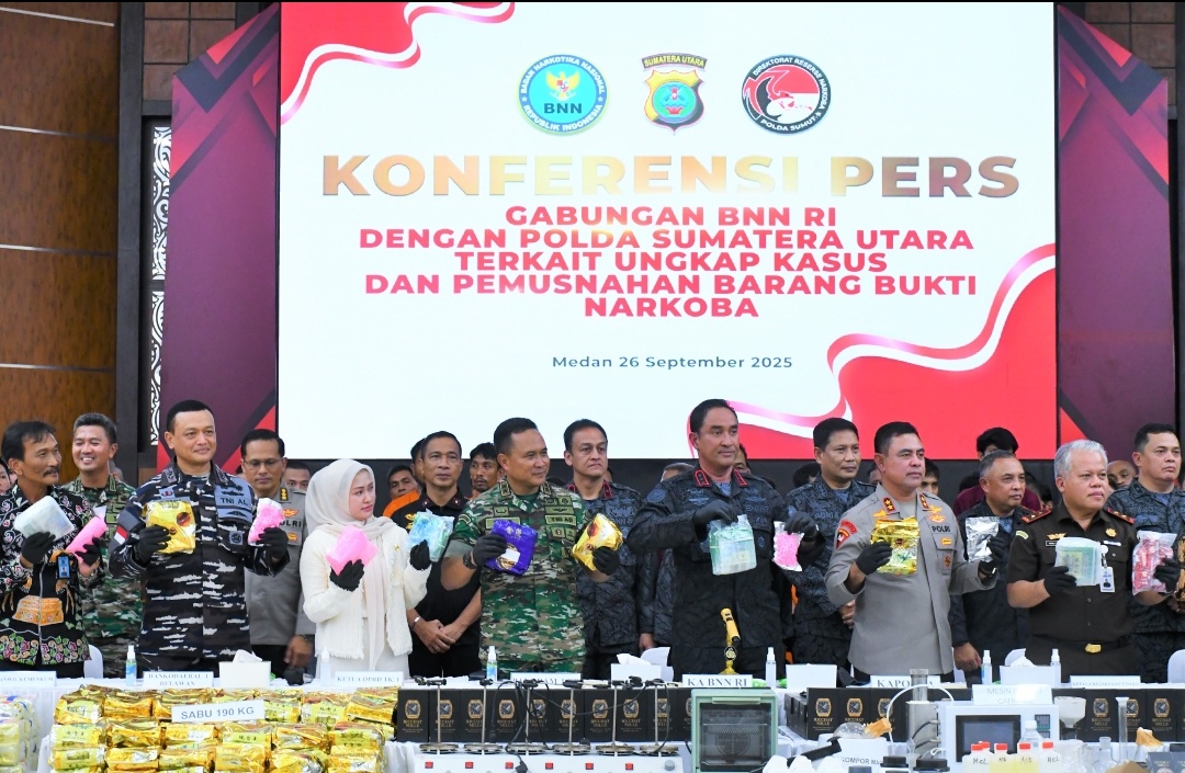 TNI AL, Belawan,Swaranusa7.com- Komandan Komando Daerah Angkatan Laut I (Kodaeral I) Laksamana Muda TNI Deny Septiana, S.I.P., M.A.P., menghadiri Konferensi Pers Gabungan BNN RI dengan Polda Sumatera Utara serta Pemusnahan Barang Bukti Narkoba yang dipimpin Kepala BNN RI Komjen Pol Suyudi Ario Seto, S.H., S.I.K., M.Si., bertempat di Aula Tribrata Polda Sumatera Utara, Jalan Sisingamangaraja, Medan, Jumat (26/09/2025).