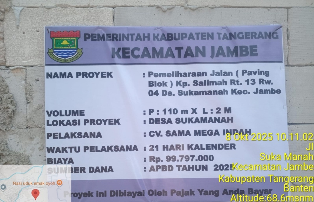Kabupaten Tangerang ,Swaranusa7.com-Pemerintah Desa Sukamanah Kecamatan jambe Kabupaten Tangerang, terus mengakselerasi pembangunan infrastruktur demi meningkatkan kenyamanan dan kesejahteraan masyarakat. Salah satu program prioritas yang kini tengah. direalisasikan adalah pembangunan jalan lingkungan dengan sistem paving block, yang bersumber dari Anggaran Pendapatan (APBD) Tahun Anggaran 2025.