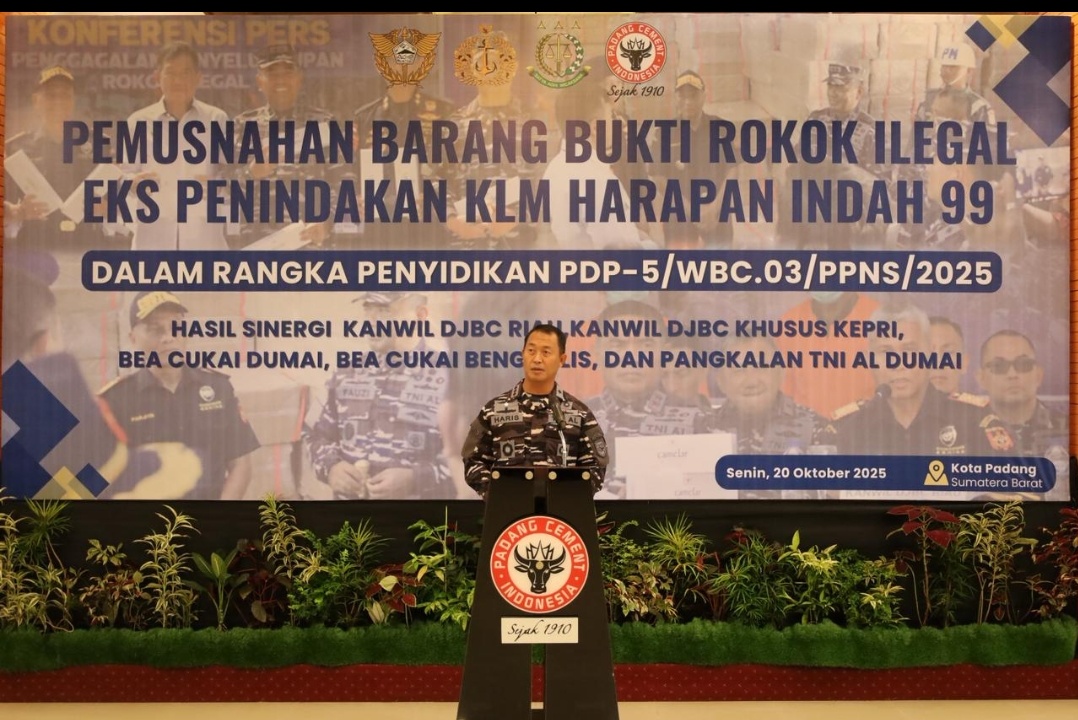 TNI AL, Dumai,Swaranusa7.com-Komandan Pangkalan TNI Angkatan Laut Dumai Kolonel Laut (P) Abdul Haris, S.E., M.M.D.S., menghadiri Press Conference dan Pemusnahan Barang Bukti Rokok Ilegal Eks Penindakan KLM Harapan Indah 99 yang digelar di Wisma Indarung PT. Semen Padang, Kecamatan Lubuk Kilangan, Kota Padang, Provinsi Sumatera Barat, Senin (20/10/2025).