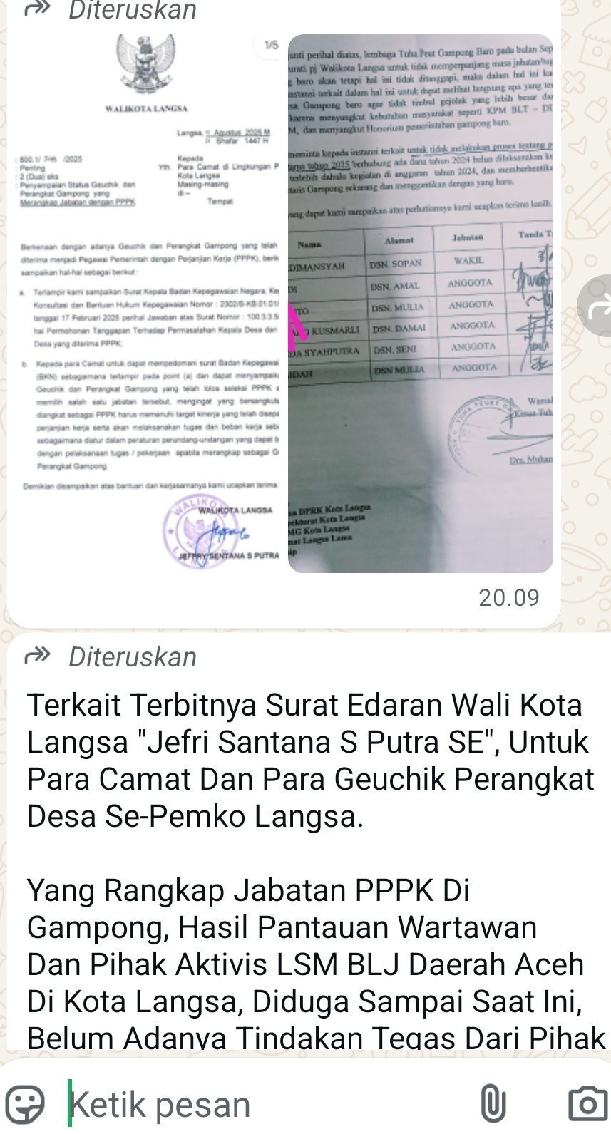 Sesuai pula, adanya terkait terbitnya surat edaran wali kota langsa “Jefri Santana S Putra SE”. Yang di tujukan ke para camat dan para geuchik juga ke perangkat desa se-pemko langsa, yang rangkap jabatan PPPK (paruh waktu) di gampong. Pada tanggal, 15 agustus 2025 beberapa bulan yang lalu. Yang berbunyi dalam surat edaran wali kota langsa tersebut, “dengan nomor surat. 800,1/3143/2025. Sifat, penting. Lampiran, 2 (dua) eks. Perihal, penyampaian status geuchik dan perangkat gampong. Yang berangkat jabatan, dengan PPPK, di lanjuti dengan narasi surat edaran tersebut. Berkenan dengan adanya geuchik dan perangkat gampong yang telah lolos.