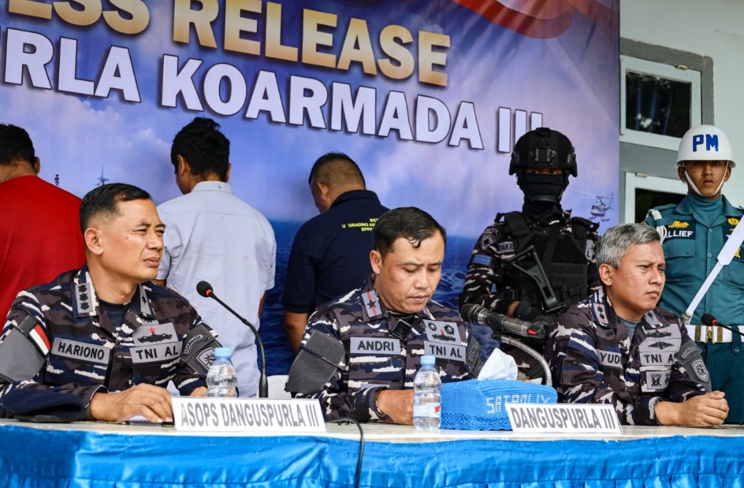 Press Release yang dilaksanakan ini dipimpin langsung oleh Komandan Gugus Tempur Laut (Danguspurla) Koarmada III Laksamana Pertama TNI Andri Kristianto, M.Han., didampingi oleh Asops Danguspurla Kolonel Laut (P) Dr. Hariono, S.H., M.Tr.Hanla., M.A.P., dan Komandan KRI Panah-626 Letkol Laut (P) Yudha Himawan, M.Tr.Opsla.